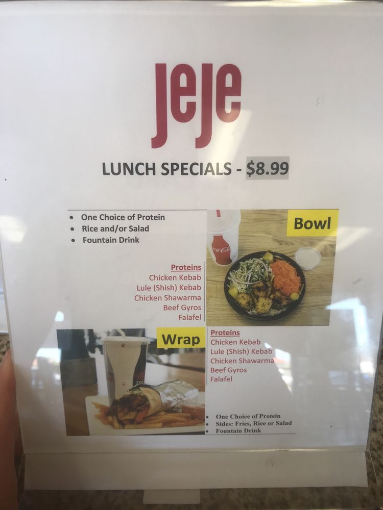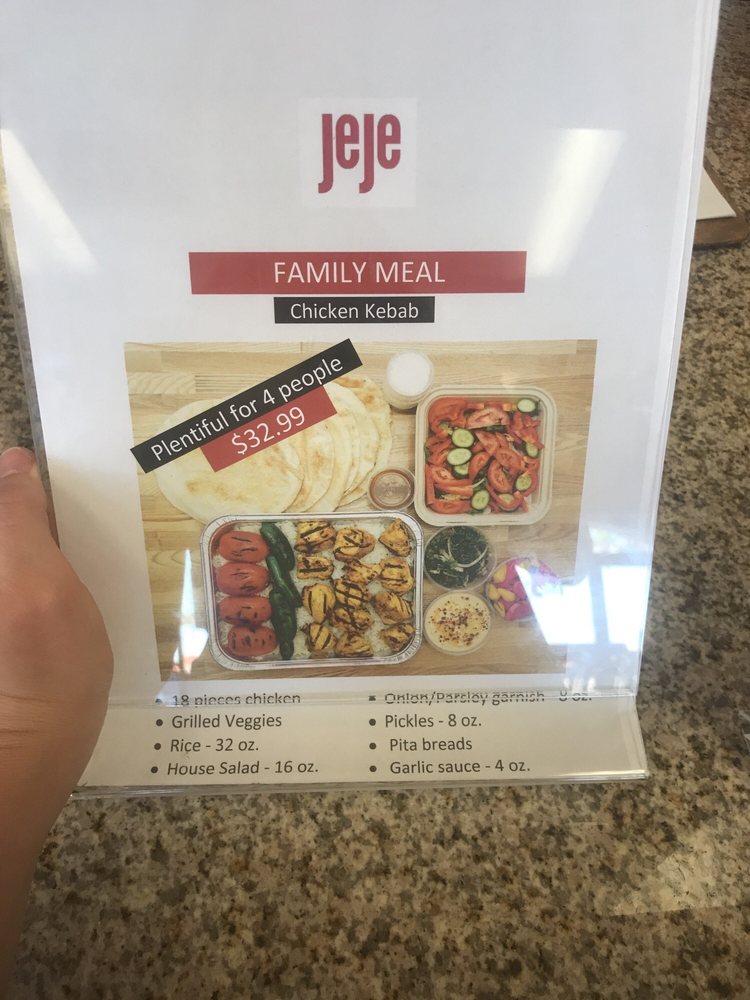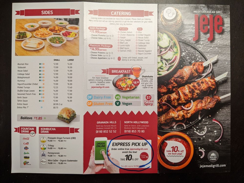 Introducing the menu at JeJe Mediterranean Grill, a delightful spot for Mediterranean cuisine located in Granada Hills, California. This Halal eatery truly shines with its vibrant offerings, catering to diverse dietary needs, including many vegetarian and vegan options. Guests can indulge in a variety of flavorful dishes, such as the highly praised chicken shawarma bowl and steak plates, complemented by a rich garlic sauce that sets them apart. The casual atmosphere is perfect for family lunches or quick dinners, and they offer both delivery and takeout for your convenience.